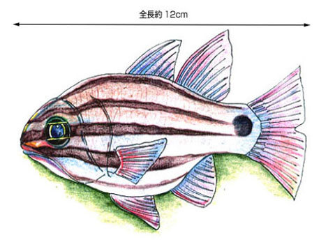 他のお仲間とは、ほとんど姿、形は変わりません。 名前にオオスジがつくくらいなので、体にそって入っている数本の太い筋(たてじま)で見分けると良いでしょう。 群は作らず、ひとりひっそり、浅い岩場などに住んでいる。 このオオスジイシモチのパパはえらい!メスの産んだ卵をオス(もちろんパパ)が、口の中に入れて守るのです。 保育中のオスの口の中は卵でいっぱい。 ・・・ゆえに、エサを全く食べない。けなげな姿に感動! |